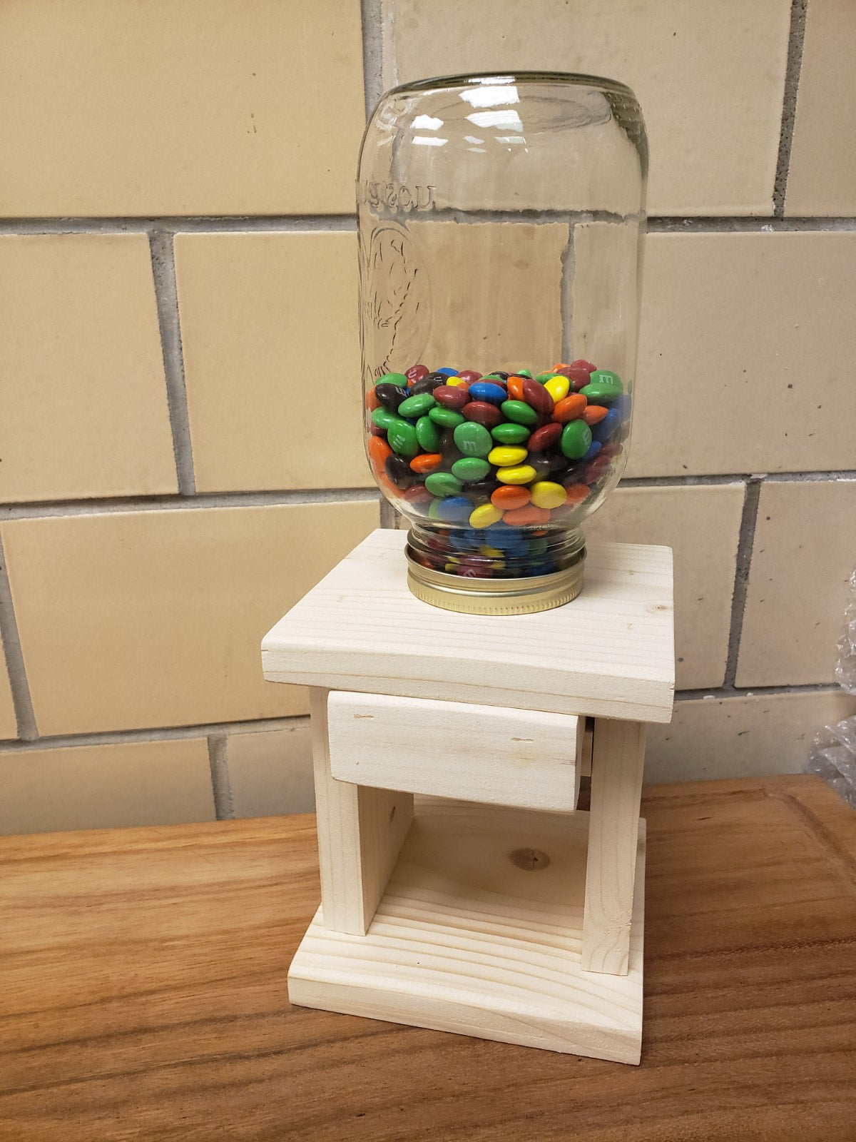 Made for small candies; our tabletop dispensers are a unique item to share a sweet treat. Simply fill the jar with your favorite candy and re-attach. Pull the slide out and retrieve your sweet reward! Available in four sizes to allow multiple candy flavor options.