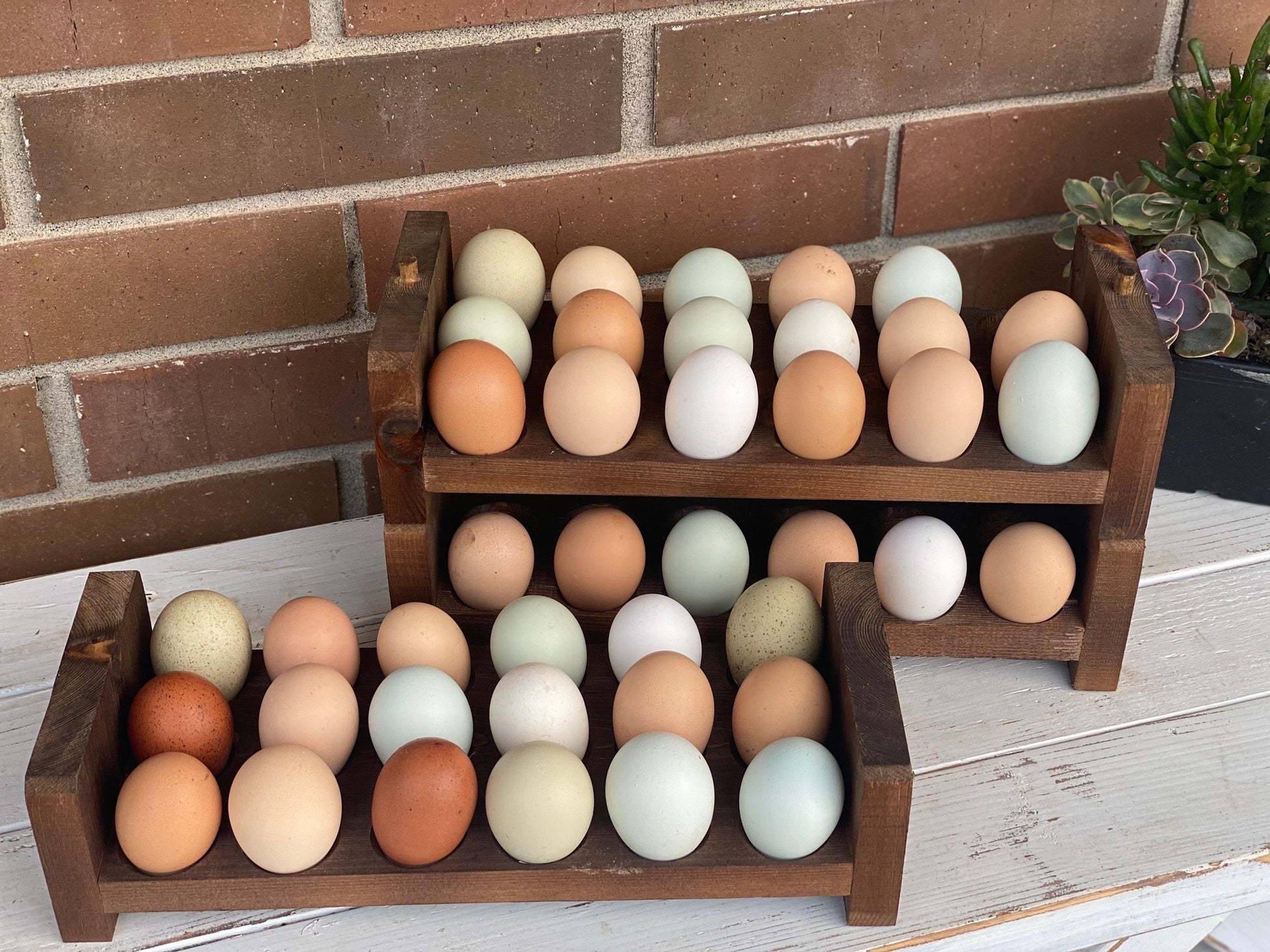 This stackable farmhouse egg holder holds 18 eggs on one layer! They are a great way to store your fresh unwashed eggs on your counter! Get more egg storage in one space! Keep track of your eggs newest to oldest with the stackable layers. They are made of locally sourced lumber to last a long time. Each egg holder is hand-crafted with love. Due to the nature of hand-crafted items, no egg holder will be exactly like another and may have minor imperfections. We strive to give each customer a quality item that adds the rustic charm of farm-fresh eggs in their kitchen. If you have any questions about this item, please message us and we would be happy to answer them.